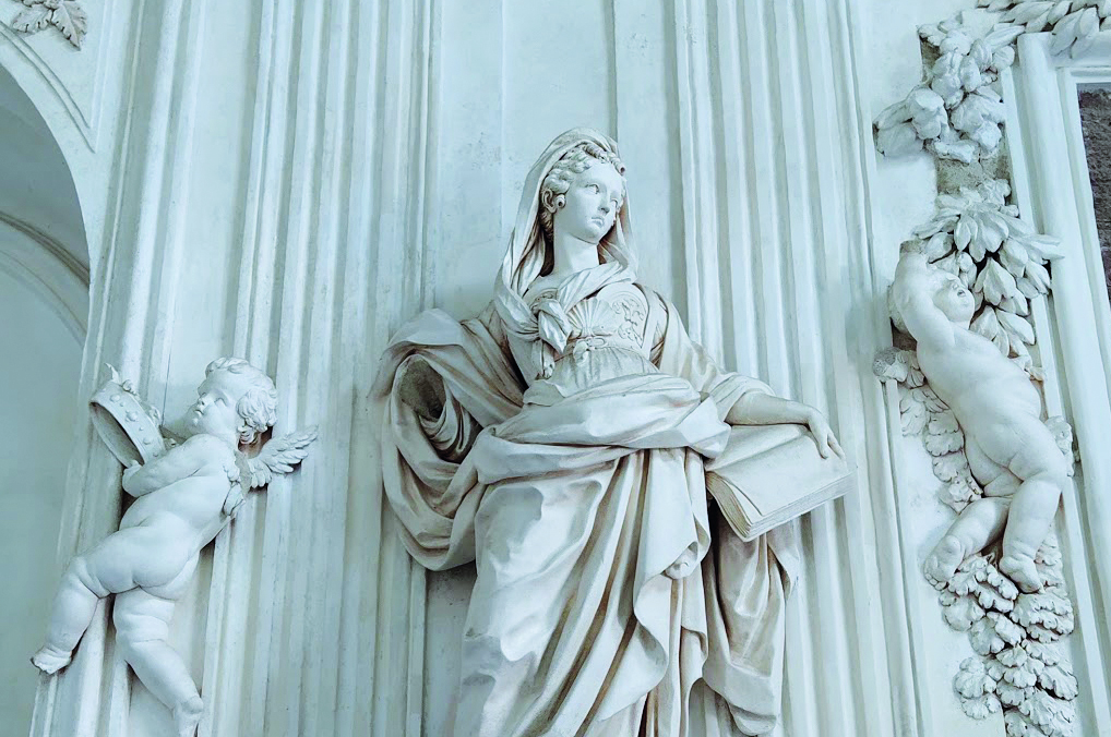 Le quattro Virtù femminili lungo le pareti laterali rappresentano personificazioni allegoriche che, nonostante la mancanza di iscrizioni sui corrispettivi piedistalli, possono essere identificabili con le Virtù Teologali della Carità e della Fede e le due Virtù Cardinali della Fortezza e della Giustizia.