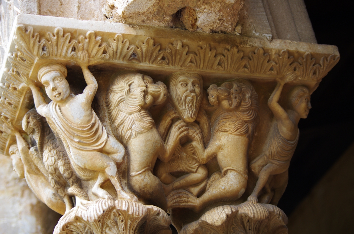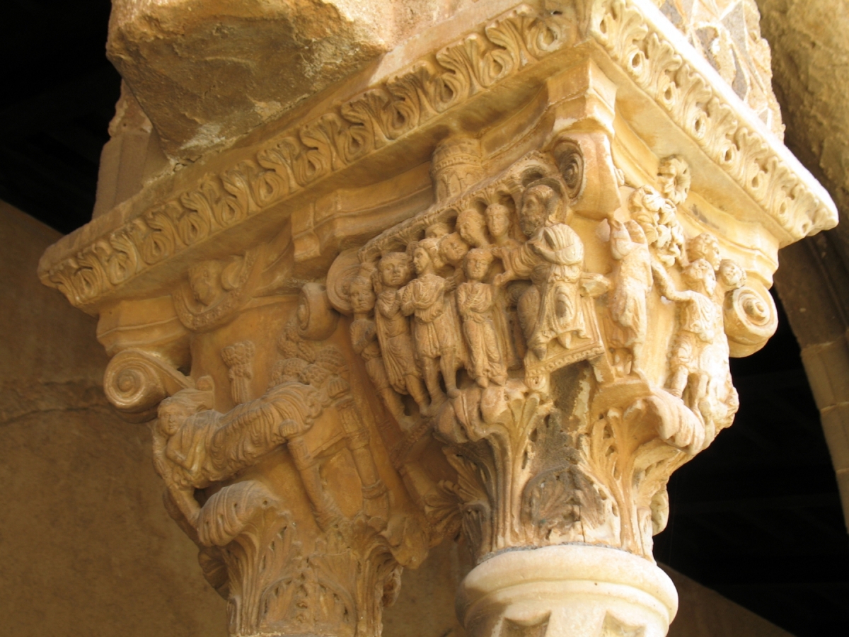 Particolare nota meritano il “Capitello dell’annunciazione”, il più leggiadro di tutti, posto nelle coppie di quattro colonne all’angolo nord-est ed il “Capitello della dedica” (il numero diciannove del braccio destro), nel quale il re è raffigurato nell’atto di offrire alla Vergine la sua Cattedrale (simile alla scena che è possibile ammirare nei mosaici della Basilica Cattedrale). Molto interessante anche il capitello che raffigura un uomo intento all’uccisione di un toro, scena allusiva al culto orientale di Mithra, e quello che rappresenta un acrobata, la cui posizione richiama la figura della Trinacria, simbolo della Sicilia.