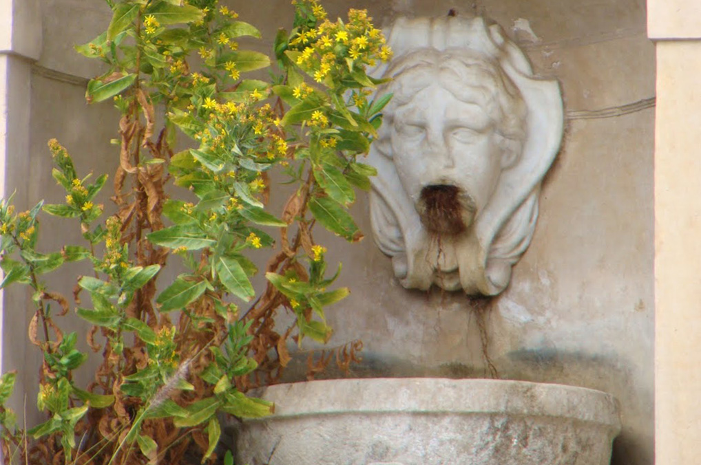 Al di sopra di queste figure, dodici bocche leonine lasciano sgorgare acqua nella vasca che, unitamente alla folta e vivace vegetazione ed ai giochi di luce tra le penombre del porticato, crea un contesto di pace e serenità unico nel suo genere.