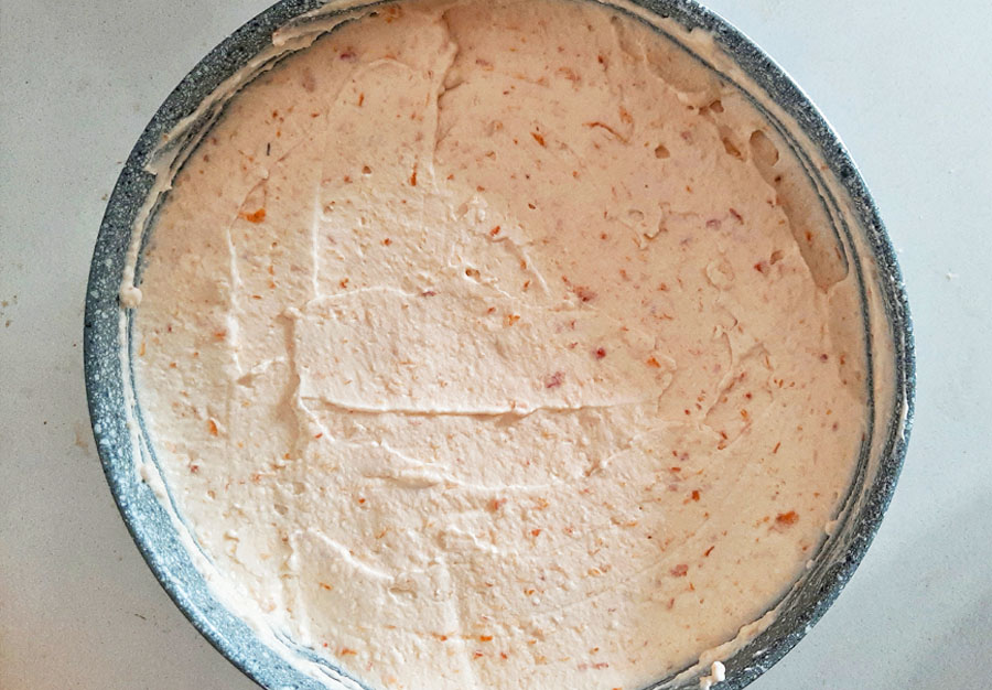 Trasferisci in uno stampo a cerniera già foderato con carta forno (sul fondo) appiattendo per bene la base di biscotto con l’aiuto di un cucchiaio. Metti in frigo per almeno 1h.